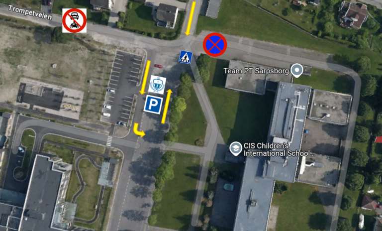Se også bildet for hvor elevene skal krysse fra parkeringsplassen og over til skolen. Vi oppfordrer foreldrene til de yngste elevene til å følge barna til inngangen. På denne måten reduserer vi risikoen for ulykker mellom fotgjengere og kjøretøy, og som en ytterligere bonus vil dere mest sannsynlig møte og få muligheten til å hilse på andre elever, foreldre og lærere – noe som igjen bidrar positivt til skolemiljøet.